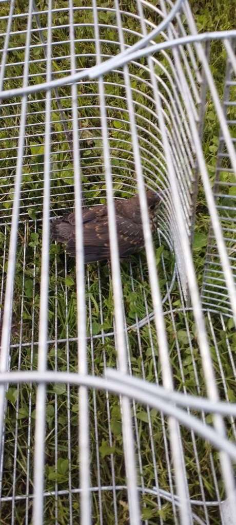 Слеток певчего дрозда забрался в птичью клетку, валявшуюся за гаражом, и не мог понять как оттуда выбраться. После освобождения моментально убежал в заросли крапивы, после чего вспорхнул на дерево и стал звать родителей.